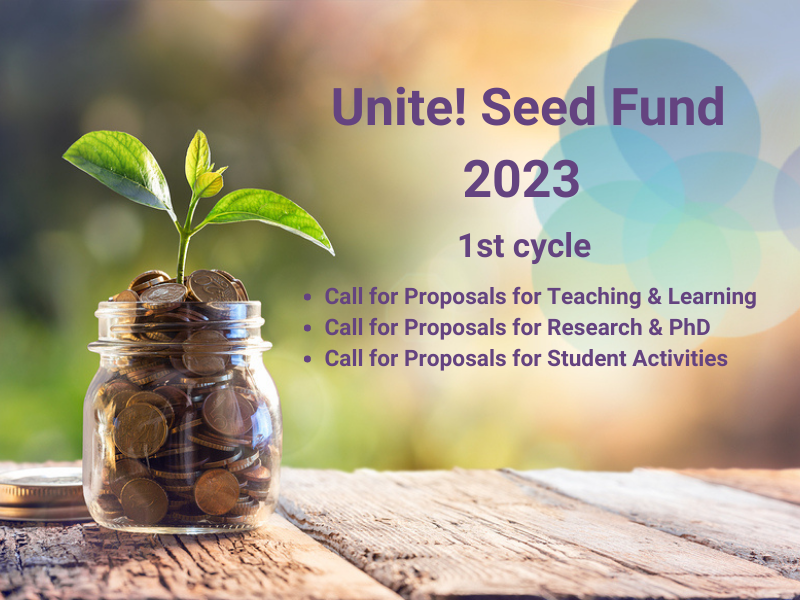 The aim of Unite! is to be an innovative, collaborative, inclusive and sustainable alliance. Through its ambition to realise excellence in education, research, and innovation by creating new opportunities, Unite! University alliance invites the entire Unite! community (Teaching staff, Teaching and learning units, Researchers and research Units, Students and student associations) to send proposals of collaborative projects for its first round of Seed funding. The funding is open to all subjects and topics and is aimed at both in-person, hybrid, and purely digital formats.