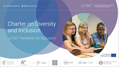 This charter applies to all, i.e. faculty, staff, students, guests and external partners, who work and participate in any of Unite!’s various activities. The entire Unite! community is very strongly committed to cultivating a climate of mutual respect and preventing and decisively opposing (direct and indirect) discrimination of any kind within this joint project.