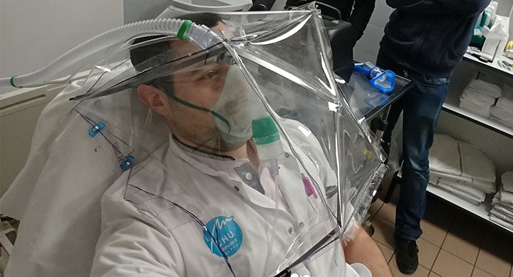 Nicolas Béraud, a researcher at the G-SCOP* laboratory and a teacher at IUT GMP**, participated in the development of the ORL quarantine bubble for the helicopter transfer of Covid-19 patients.
