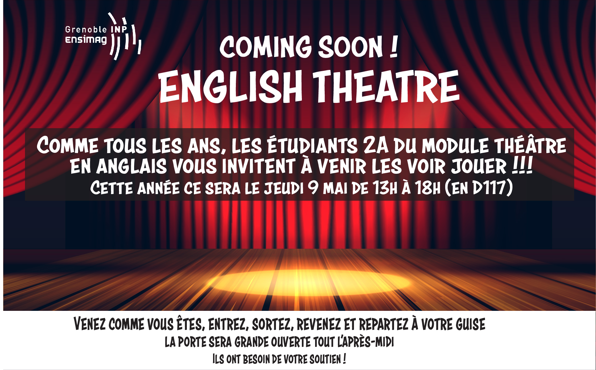 Les étudiant.e.s 2A du module théatre en anglais vous invitent à venir les voir jouer ! Le jeudi 9 mai de 13h à 18h (en D117).
