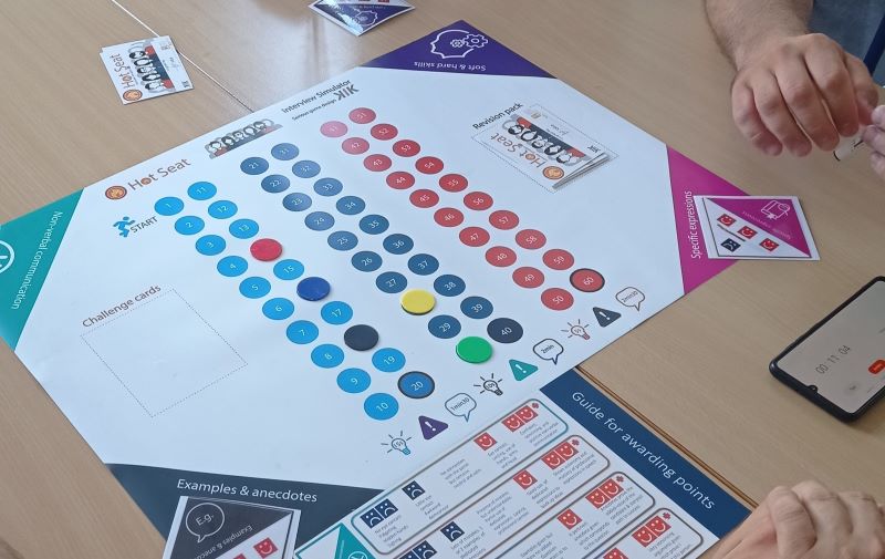 HOTSEAT comporte un éventail de cartes avec des questions générales et d'autres plus pointues. Ces questions sont complétées avec des conseils et des exemples de réponses possibles. Utilisé en parallèle par plusieurs groupes d'une même classe, le jeu apporte aussi une dimension compétitive à l'exercice. Les élèves se prennent facilement au jeu assumant tour à tour le rôle du recruteur et celui du candidat.
