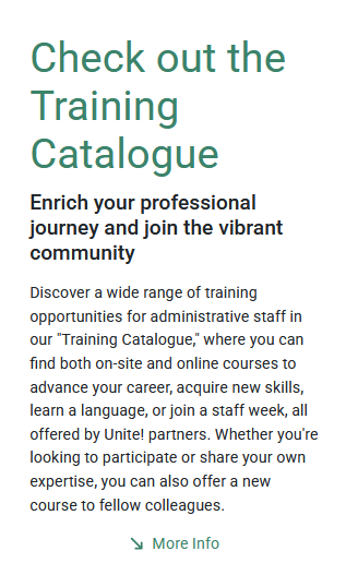 Avec Unite!, vous bénéficiez de nombreuses opportunités pour développer votre carrière : formations ciblées, réseau professionnel européen, programmes de mobilité, perfectionnement linguistique, et bien d’autres avantages.