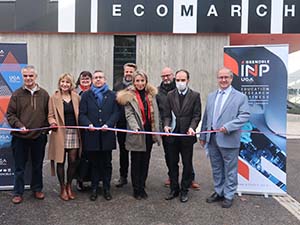 De gauche à droite : Jean-Jacques Blandin, enseignant chercheur Grenoble INP - Phelma, UGA / SIMaP et porteur du projet Écomarch, Joëlle Hours, conseillère départementale, Anne Vilcot, directrice de Grenoble INP - Phelma, UGA, Christophe Ferrari, président de Grenoble Alpes Métropole, Pierre Labriet, conseiller délégué enseignement supérieur et recherche à Grenoble-Alpes Métropole, Catherine Staron, vice-présidente déléguée enseignement supérieur, recherche et innovation à la Région Auvergne-Rhône-Alpes, Pierre Guidi, conseiller municipal de Saint-Martin-d'Hères, Samy Sisaid, sous-préfet à la Relance, Yannick Champion, directeur du laboratoire SIMaP, Pierre Benech, administrateur général de Grenoble INP-UGA.