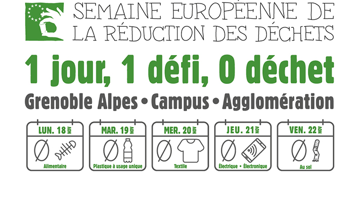 Dans le cadre de la Semaine Européenne de Réduction des Déchets (SERD), les établissements d'enseignement supérieur et de recherche grenoblois et les collectivités territoriales s'associent pour une semaine "zéro déchet" du 18 au 23 novembre 2019 : chaque jour, 1 défi, 0 déchet.