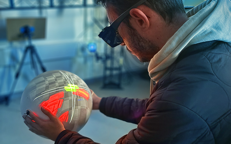 Cette boule de polystyrène dotée de marqueurs permet de visualiser et de manipuler des objets en 3D. L’utilisateur est doté de lunettes et d’une sorte de bague se portant au bout du doigt, bardées de marqueurs. Ces derniers sont traqués par plusieurs caméras disposées dans la pièce, qui suivent les mouvements de la boule et de l’utilisateur. Des logiciels reconstituent en temps réel l’image que doit théoriquement voir l’utilisateur à chaque instant, laquelle est projetée sur la boule tenue dans les mains de l’utilisateur. « Le secret, c’est la projection calibrée et la rapidité d’exécution des calculs, indique François Bérard, chercheur au LIG et enseignant à Grenoble INP - Ensimag, UGA. Les lunettes sont synchronisées avec le projecteur, ce qui permet au pixel de s’afficher exactement à l’endroit voulu sur la sphère pour créer l’illusion de profondeur. »