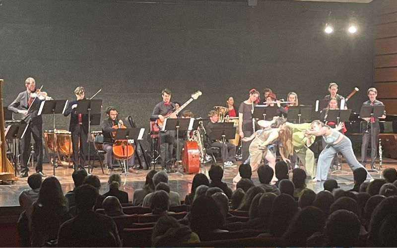 Sur scène, basson, basse, clarinettes, contrebasse, flûtes, harpe, hautbois, percussions, piano, trombone, tuba, violoncelle et quatre danseuses ont offert une performance riche et variée. Le programme mettait à l’honneur des œuvres de Duke Ellington, Pyotr Tchaikovsky, Camille Saint-Saëns, Snarky Puppy, Georges Bizet et d’autres compositeurs et compositrices de renom, mais aussi des créations originales portées par certain·es des étudiant·es eux-mêmes.